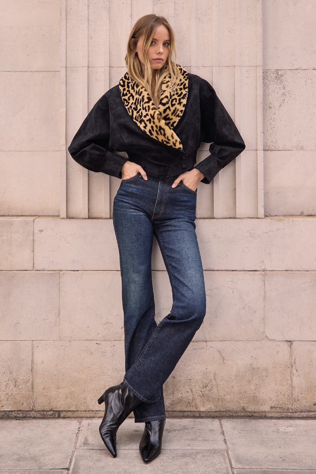The Celine Jacket brings effortless vintage charm. Made from soft black suede with a cropped fit, it’s finished with a plush leopard-print shearling collar that adds warmth and unmistakable personality. A chic, wearable classic with a hint of wild.