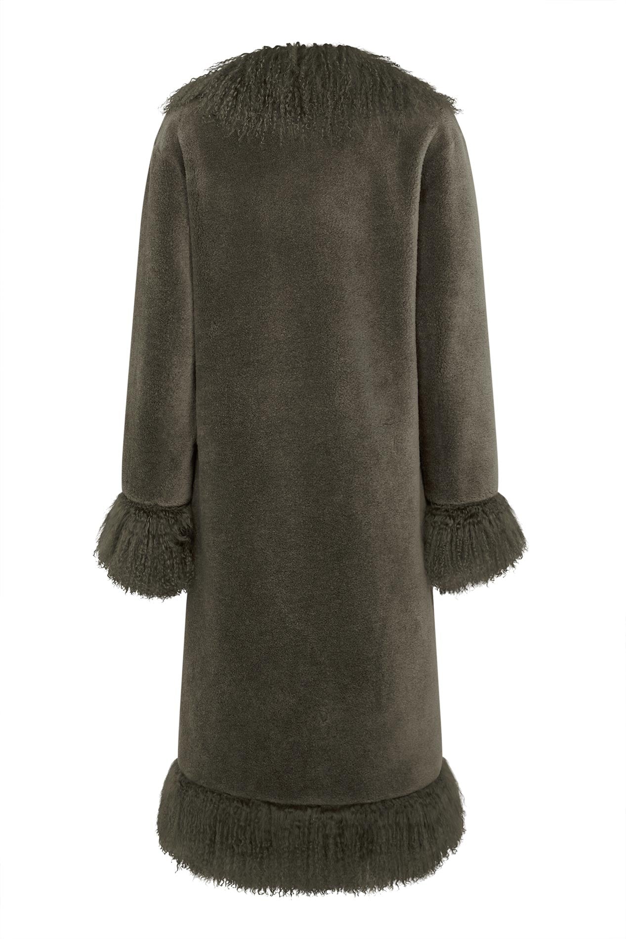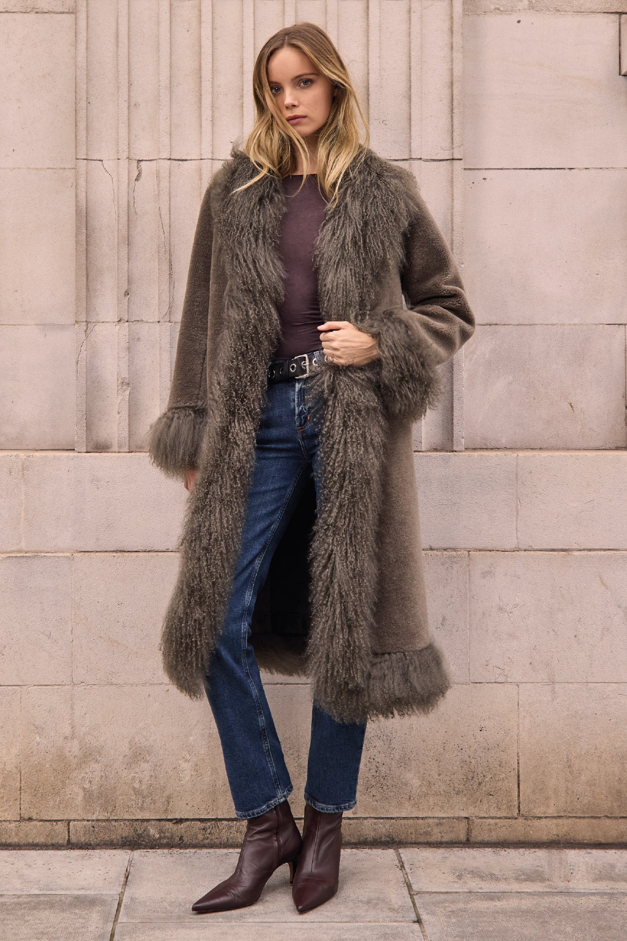 Elevate your cold-weather wardrobe with a signature style, our khaki green Donna. Fashioned from faux shearling and Mongolian trims this jacket feels deliciously textured and luxurious. Donna's relaxed silhouette and classic hue make her easy to pair with every day basics.