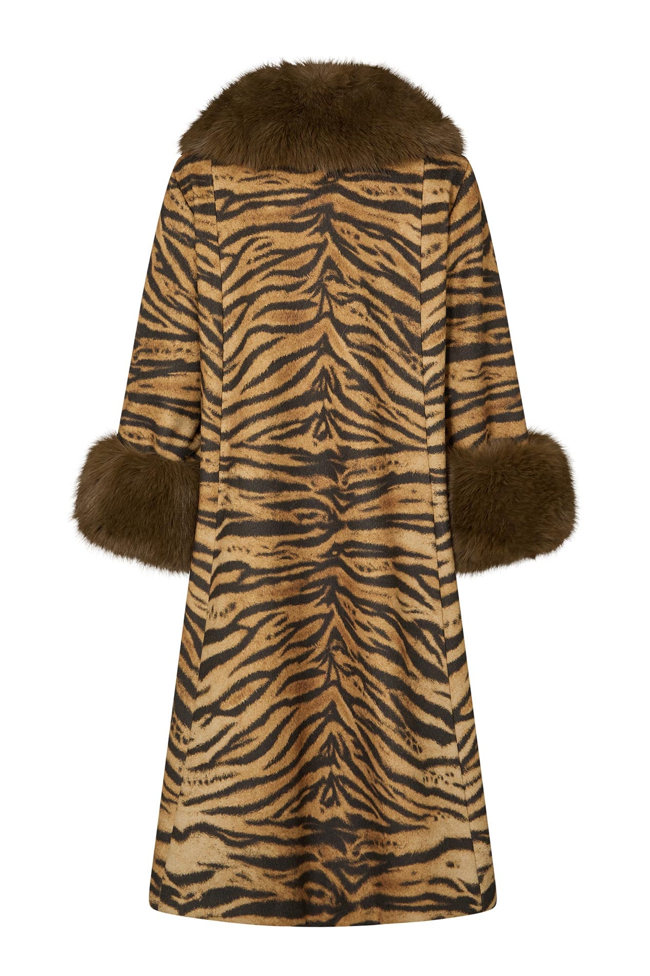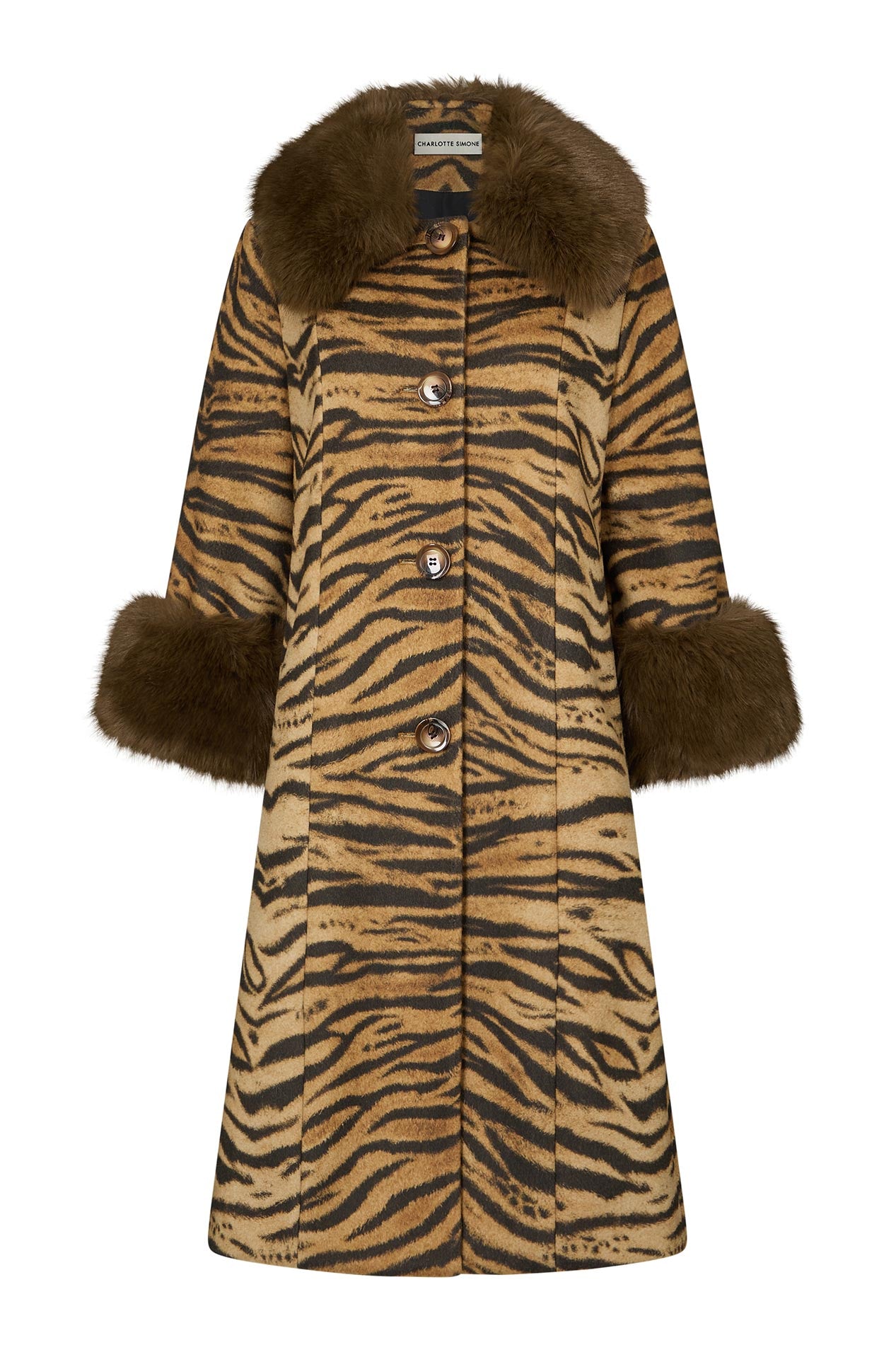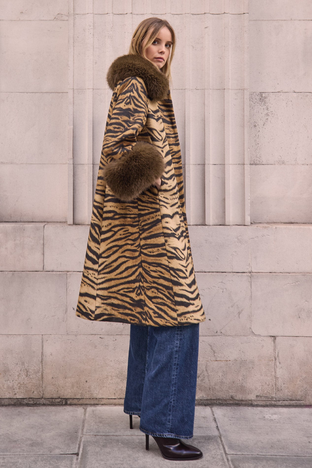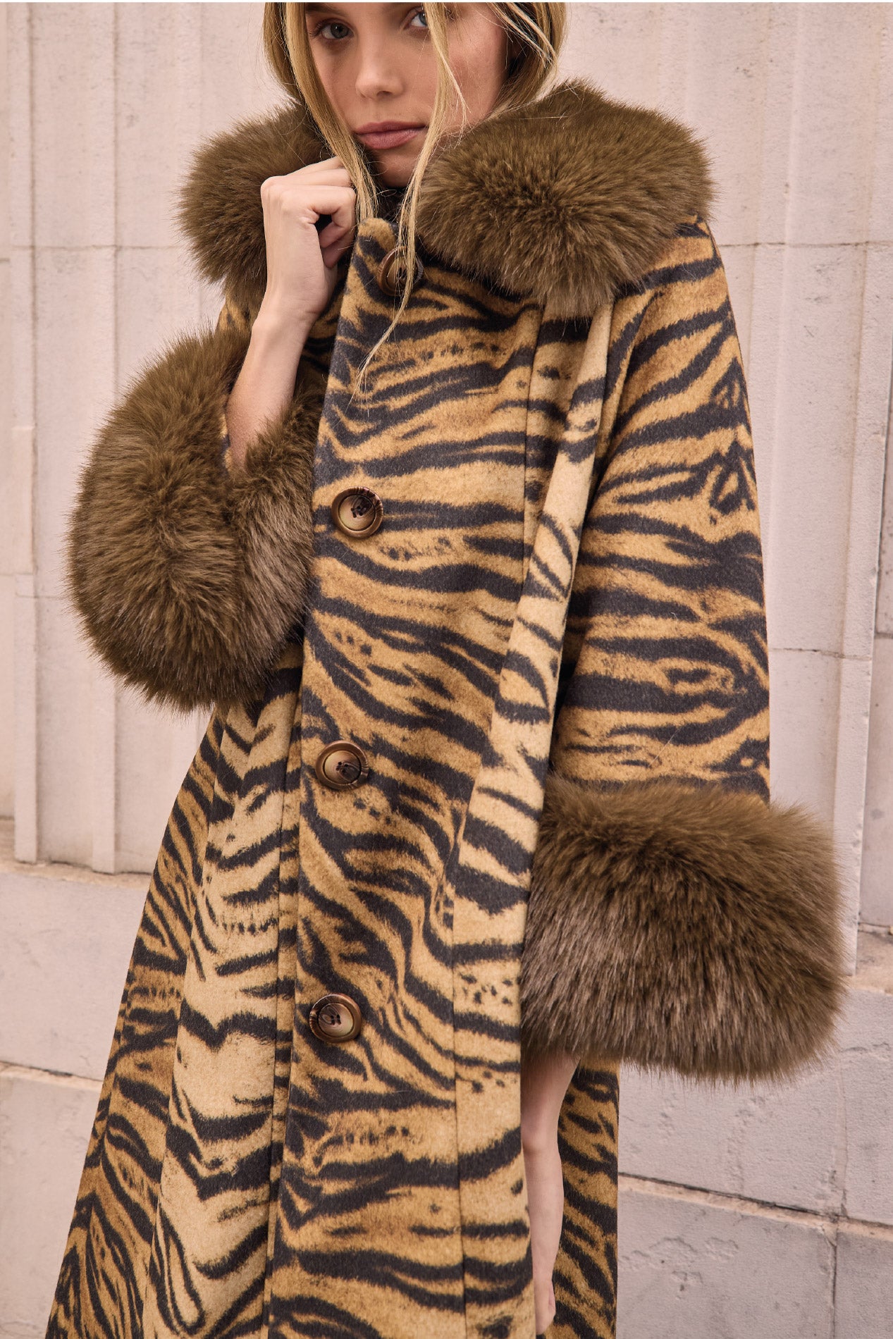 Elevate your outfit from simple to statement in an instant. Crafted from a tactile wool, faux fur cuffs; cut to an oversized silhouette, this coat is not for the faint hearted. Patterned with a custom tiger print, punctuated with marbled buttons and chocolate brown faux fur. Detach the cuff and collar if you wish!