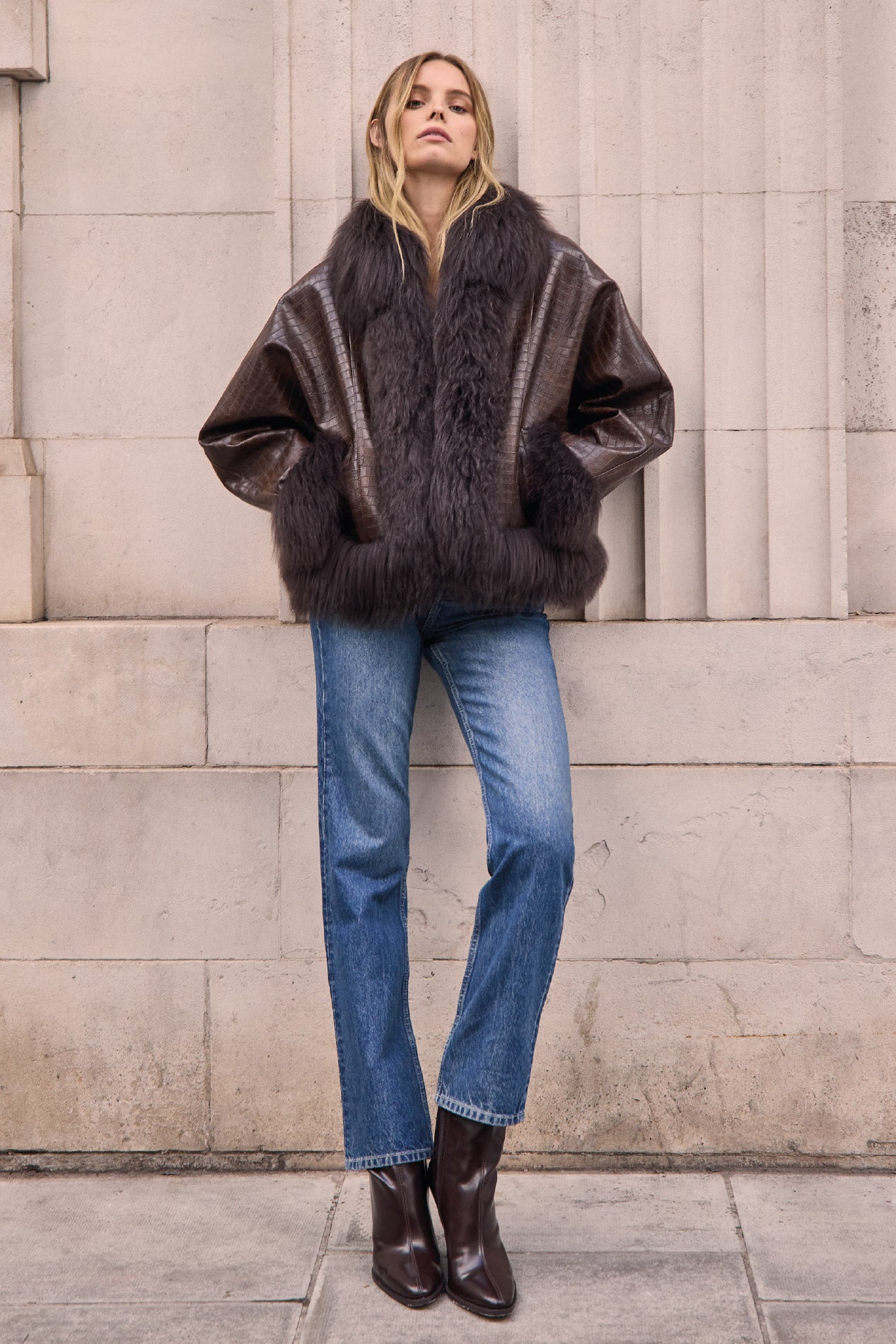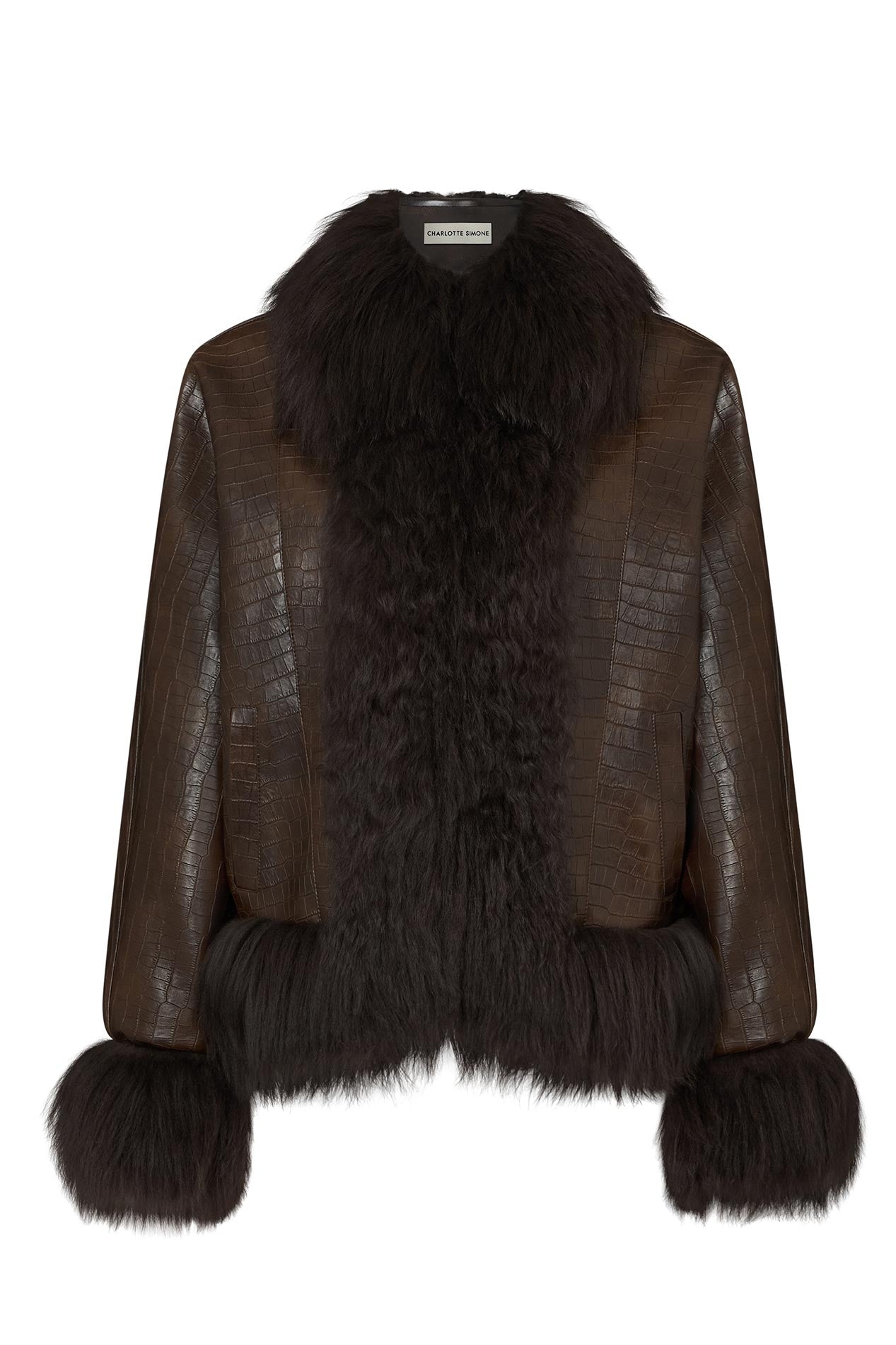 This Charlotte Simone coat will elevate your outfit from simple to statement in an instant. Crafted from croc-embossed pleather in a deep brown tone, it pairs perfectly with plush shearling trims at the collar, cuffs and hem. Textural, warm and crafted with care, Janis is a standout piece with timeless appeal.