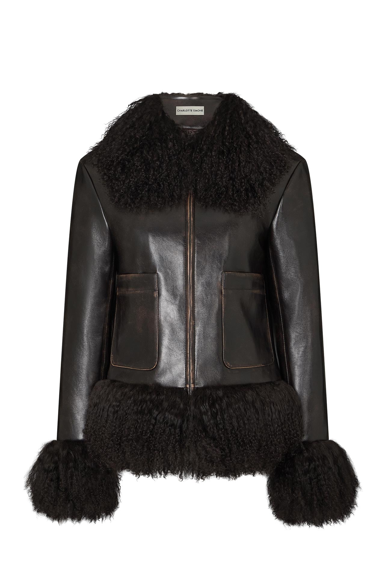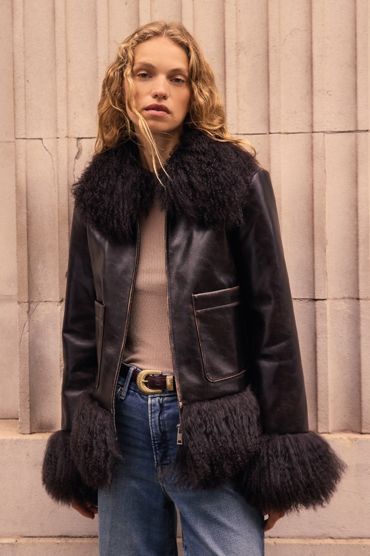 Fashioned from distressed faux leather and Mongolian trims, this jacket feels both textured and luxurious. Cropped at the waist for a flattering fit, Joni's silhouette and vintage brown details make her easy to pair with everyday basics.