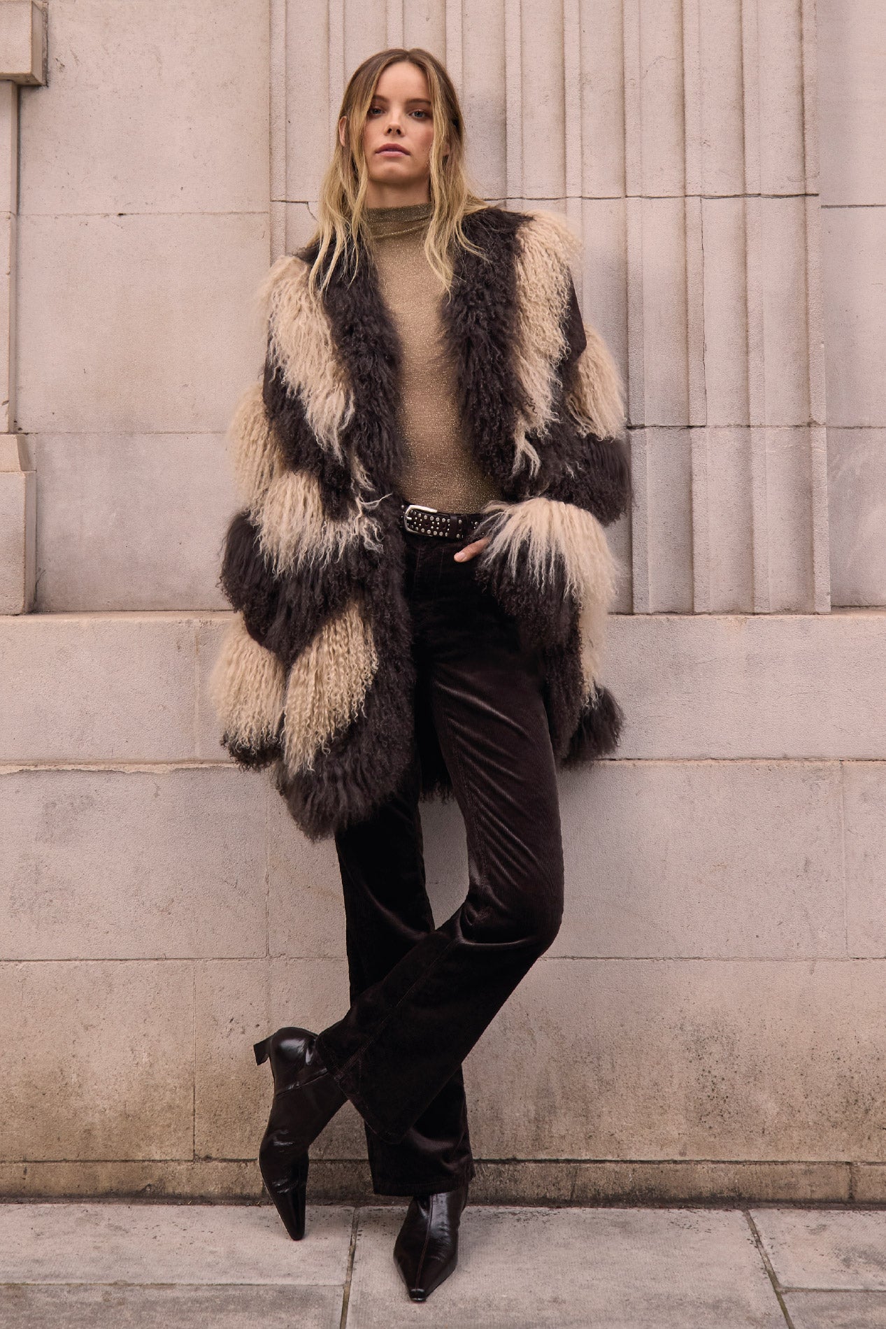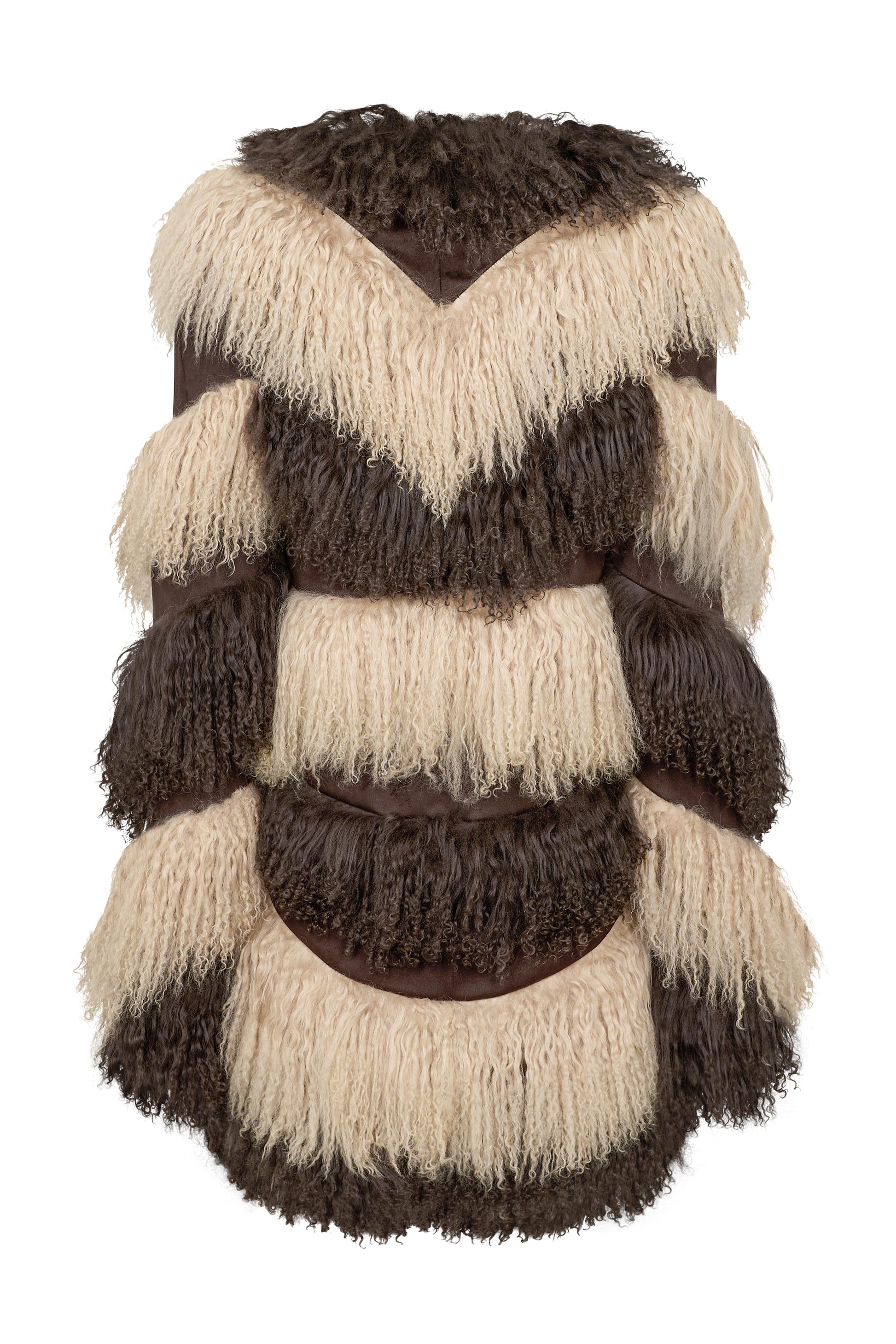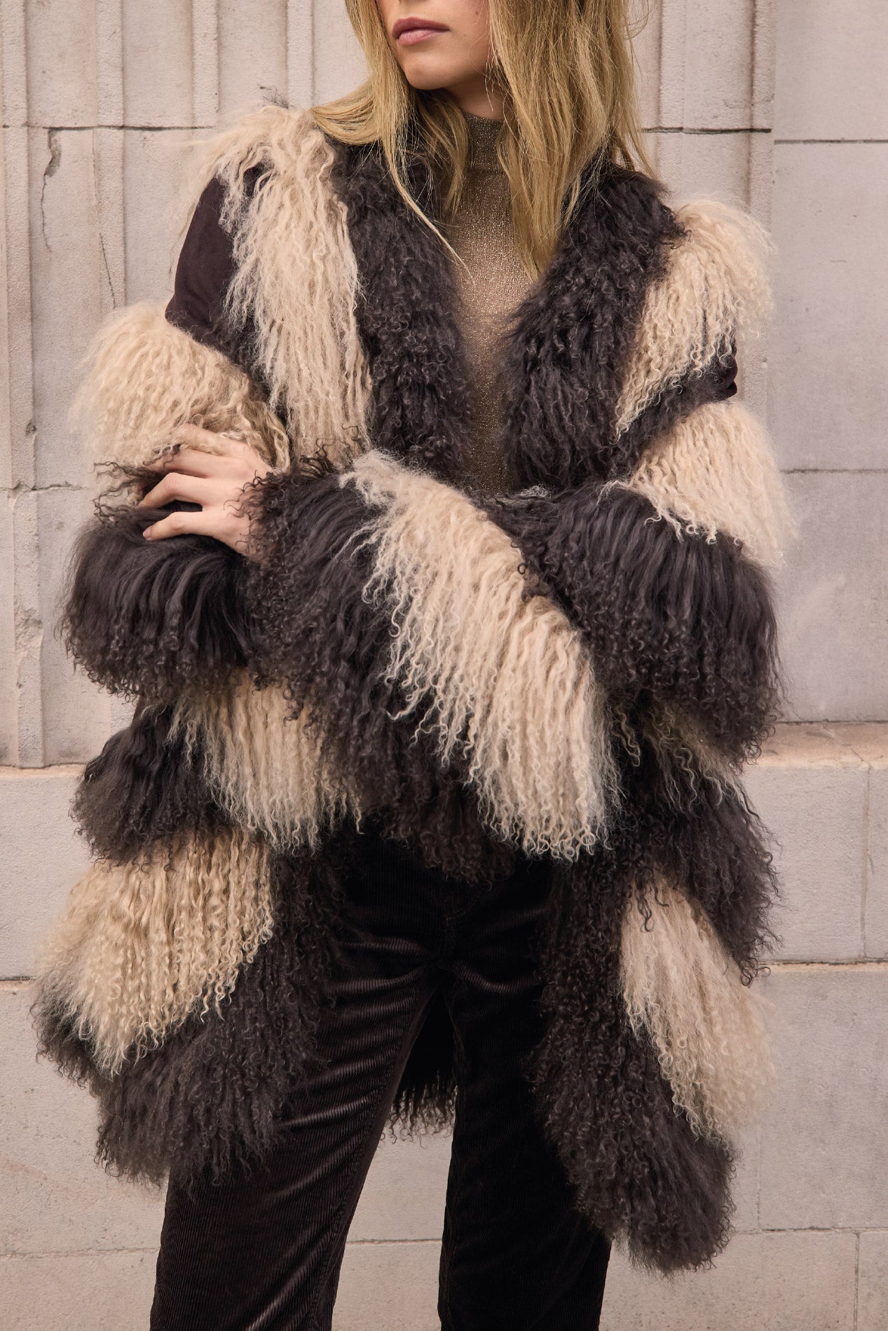The Lola Coat is a tactile patchwork dream. Crafted from alternating panels of vanilla and chocolate-toned trims for a dramatic, dimensional finish. Long, fluffy curls create movement and volume, making Lola the ultimate statement layer for winter warmth and style.
