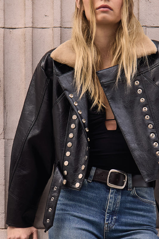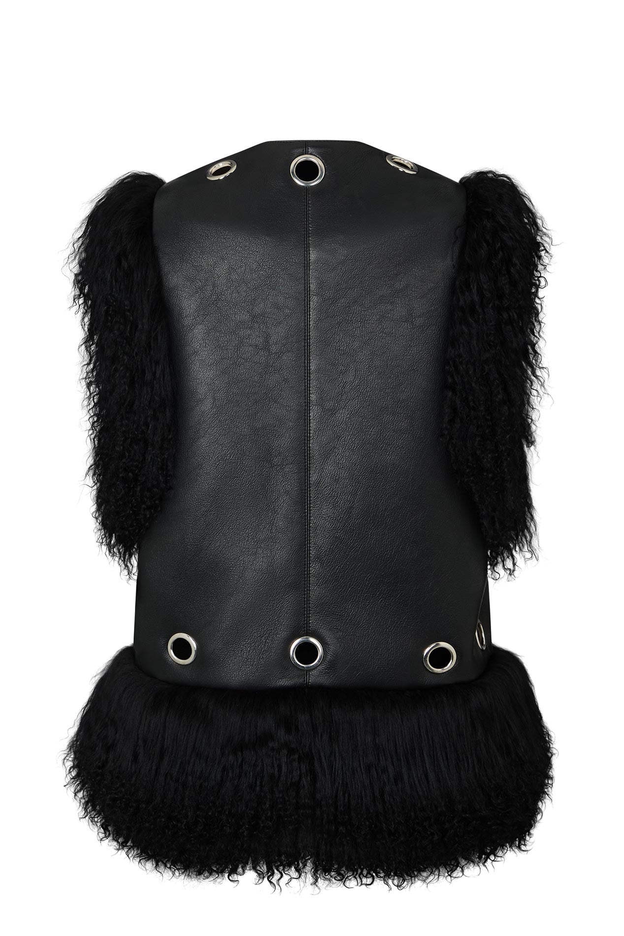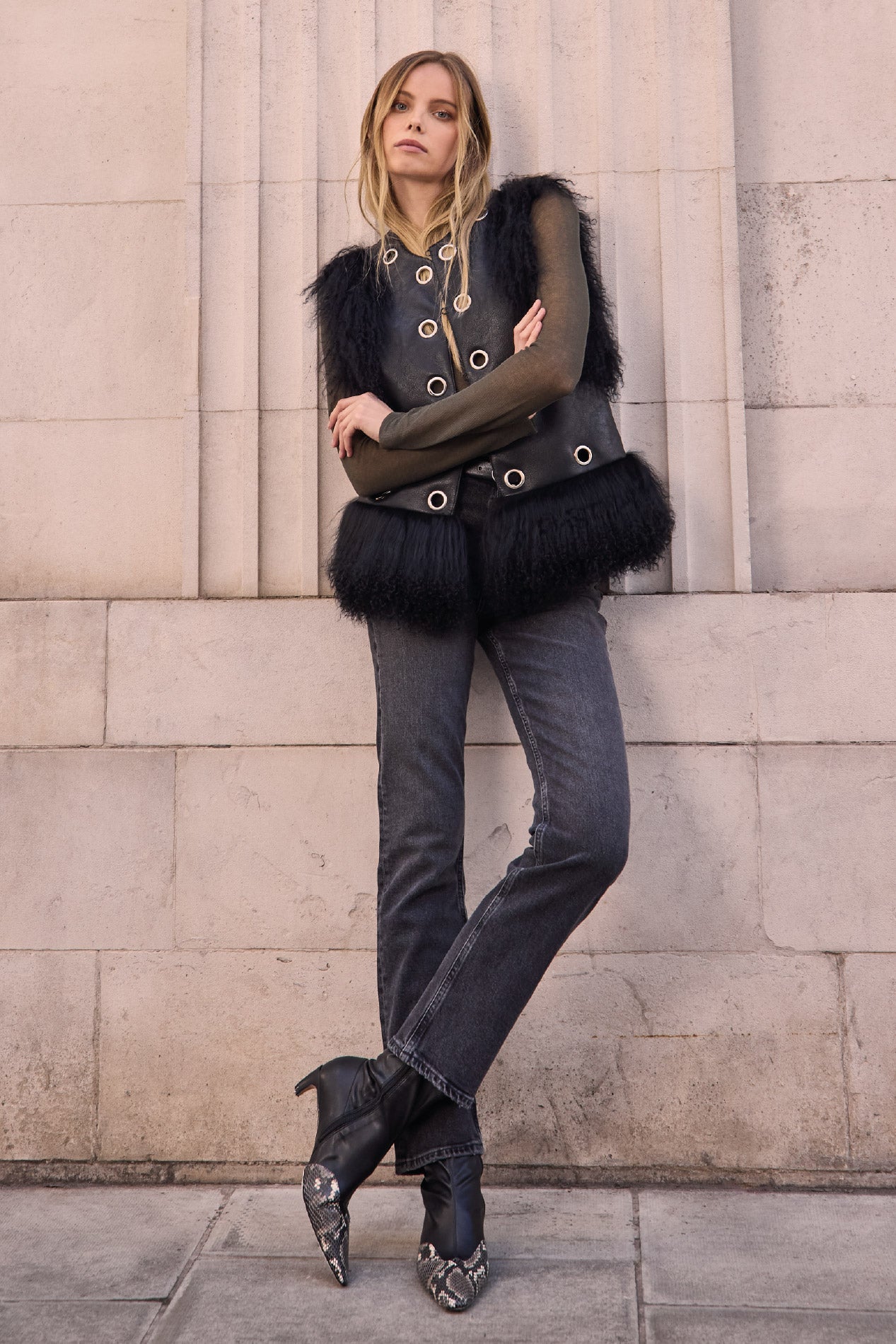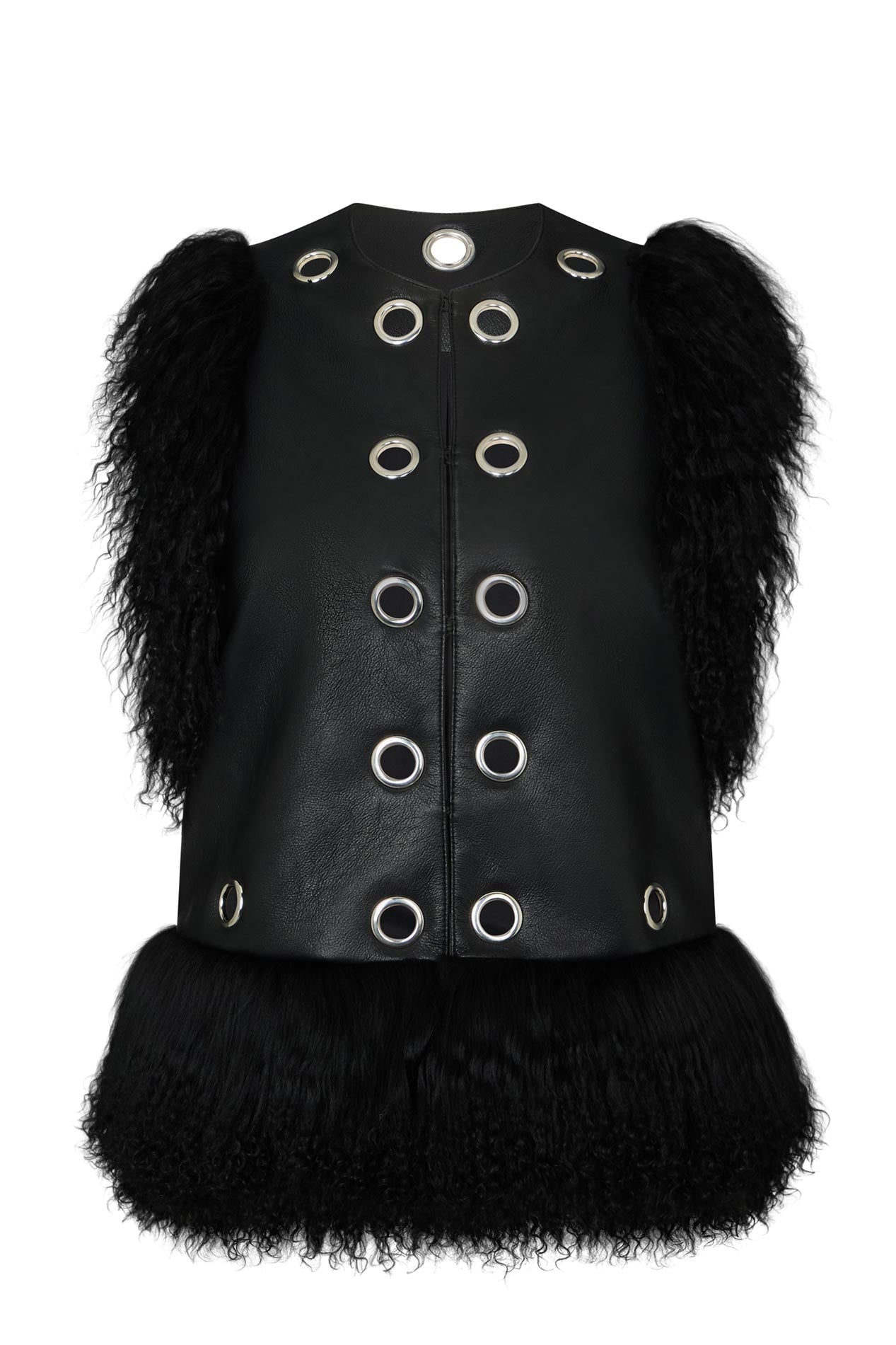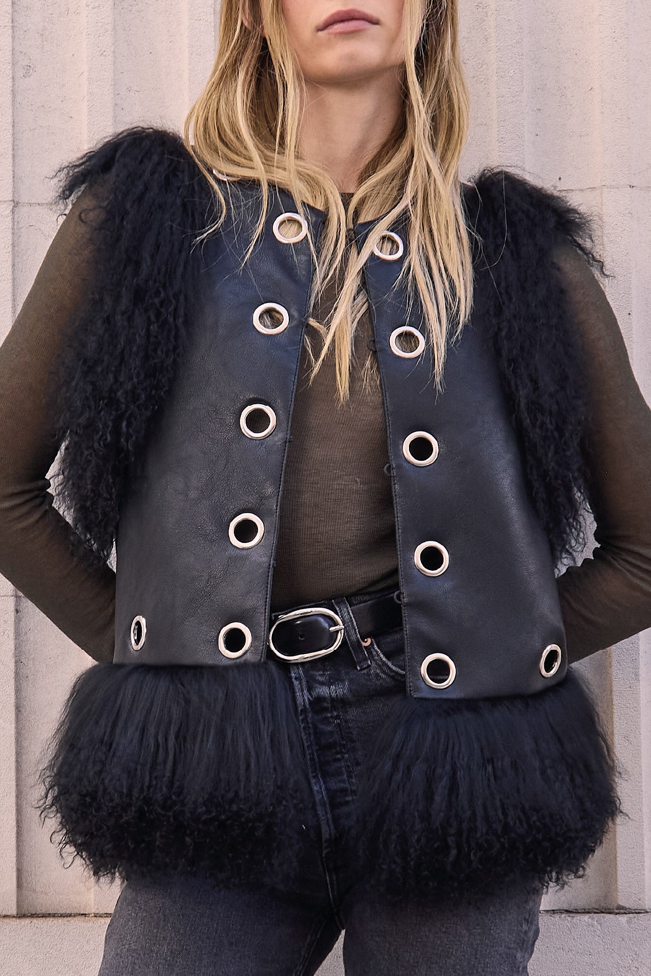 The Ozzy Gilet blends rock-inspired attitude with tactile luxury. Buttery black pleather is punctuated with oversized silver grommets & Mongolian trims for a statement finish. Detailed with classic hook fastenings and a relaxed silhoutte, layer over a mini dress or jeans for instant 'it-girl' glamour.