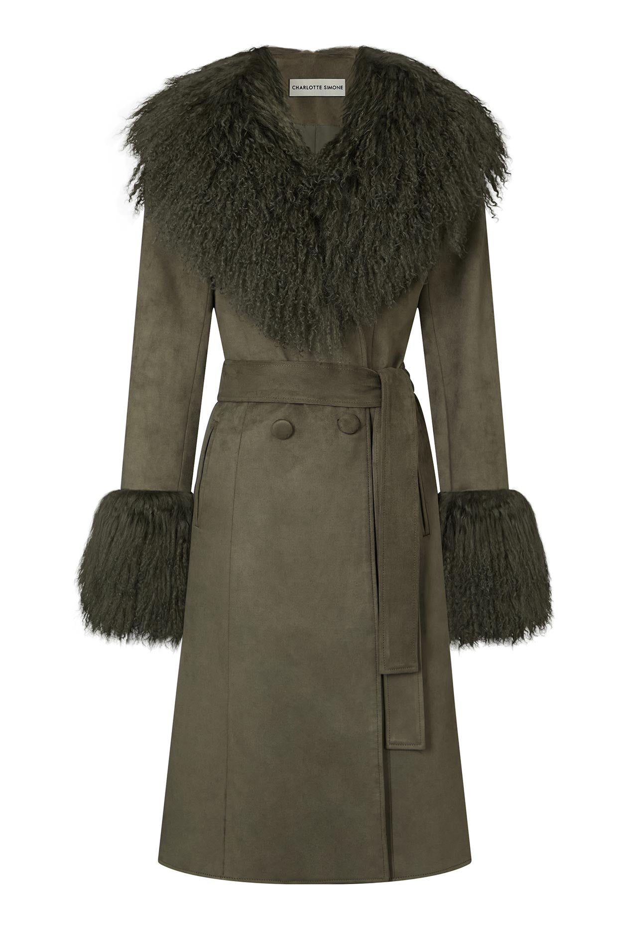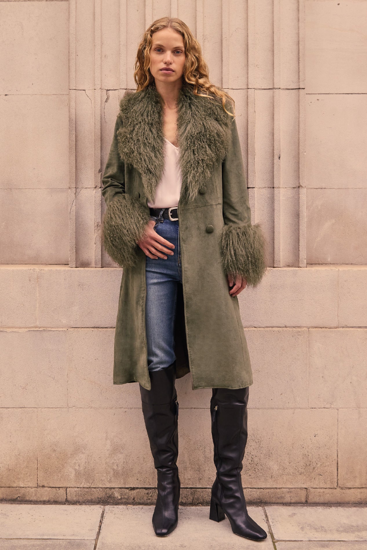 Penny is Charlotte Simone's signature style, made from faux suede and Mongolian trims with a tie belt for a flattering fit. Inspired by the traditional Afghan coat and the fabulous flair of the 70's, Penny is perfect to layer over a mini dress or denim for instant 'it-girl' glamour.