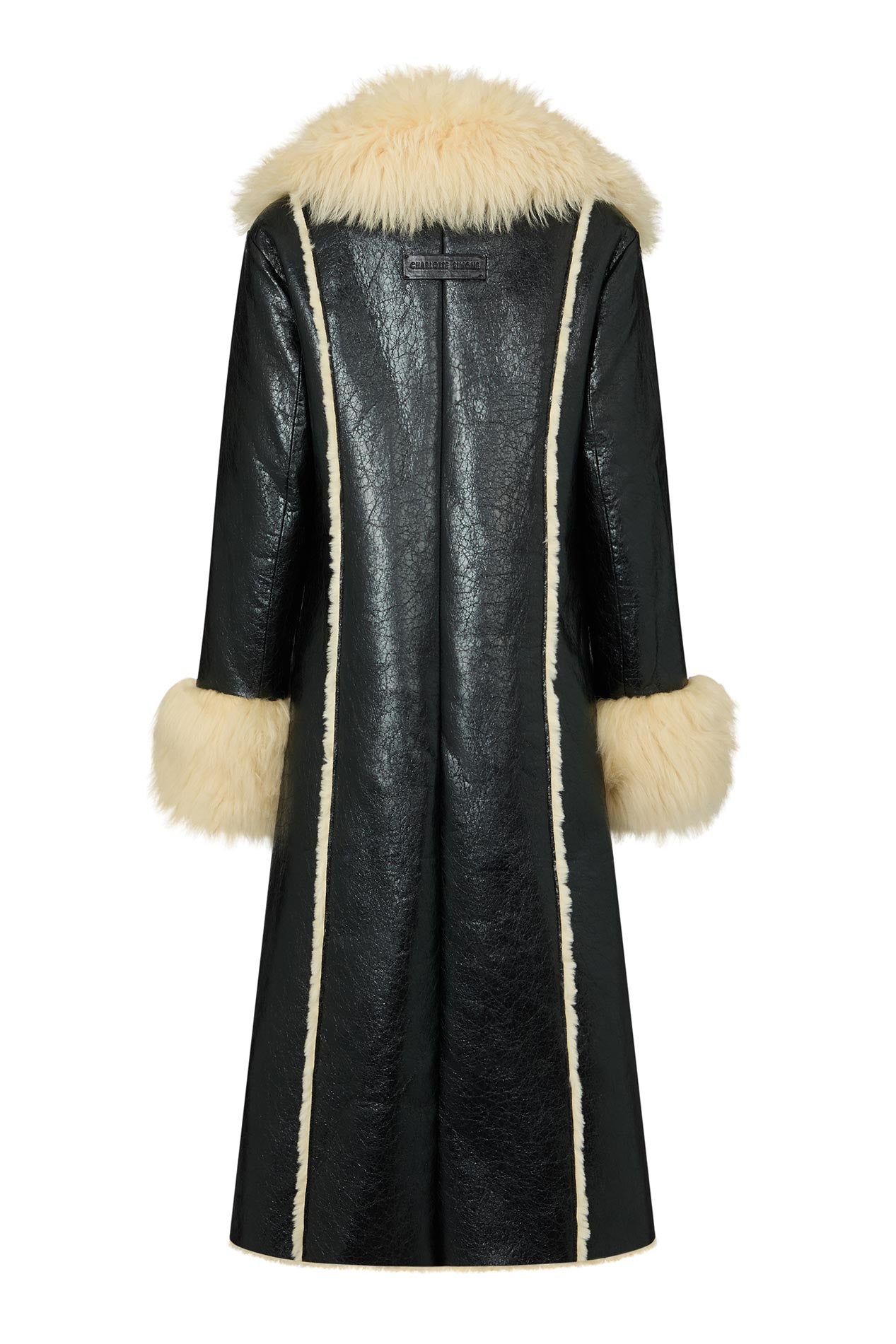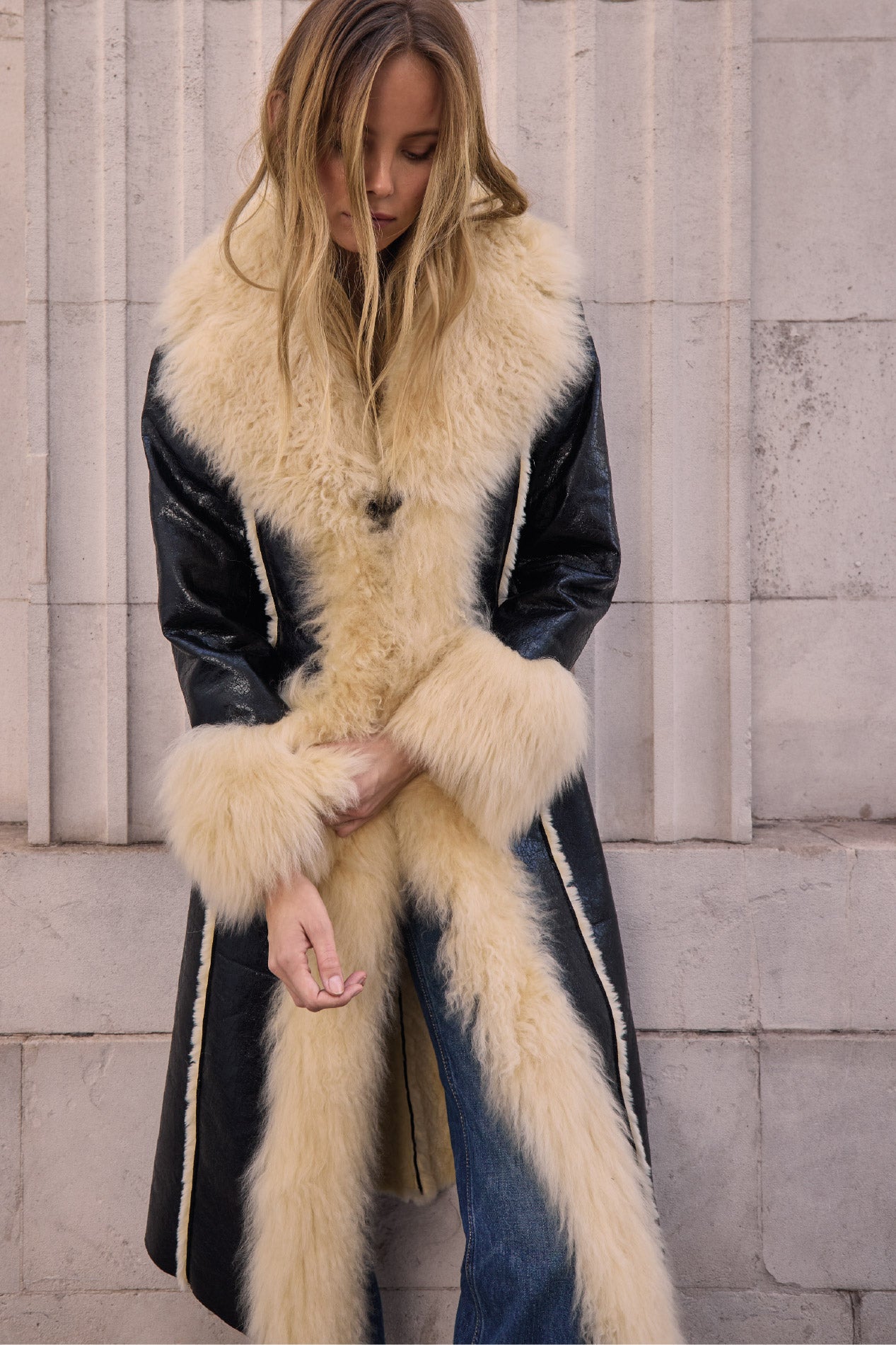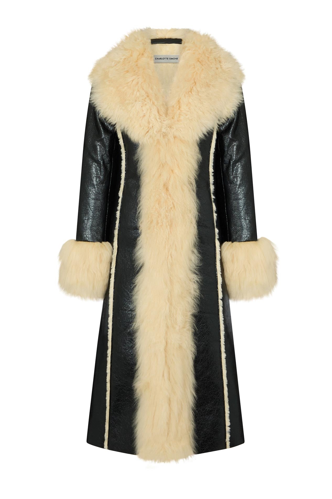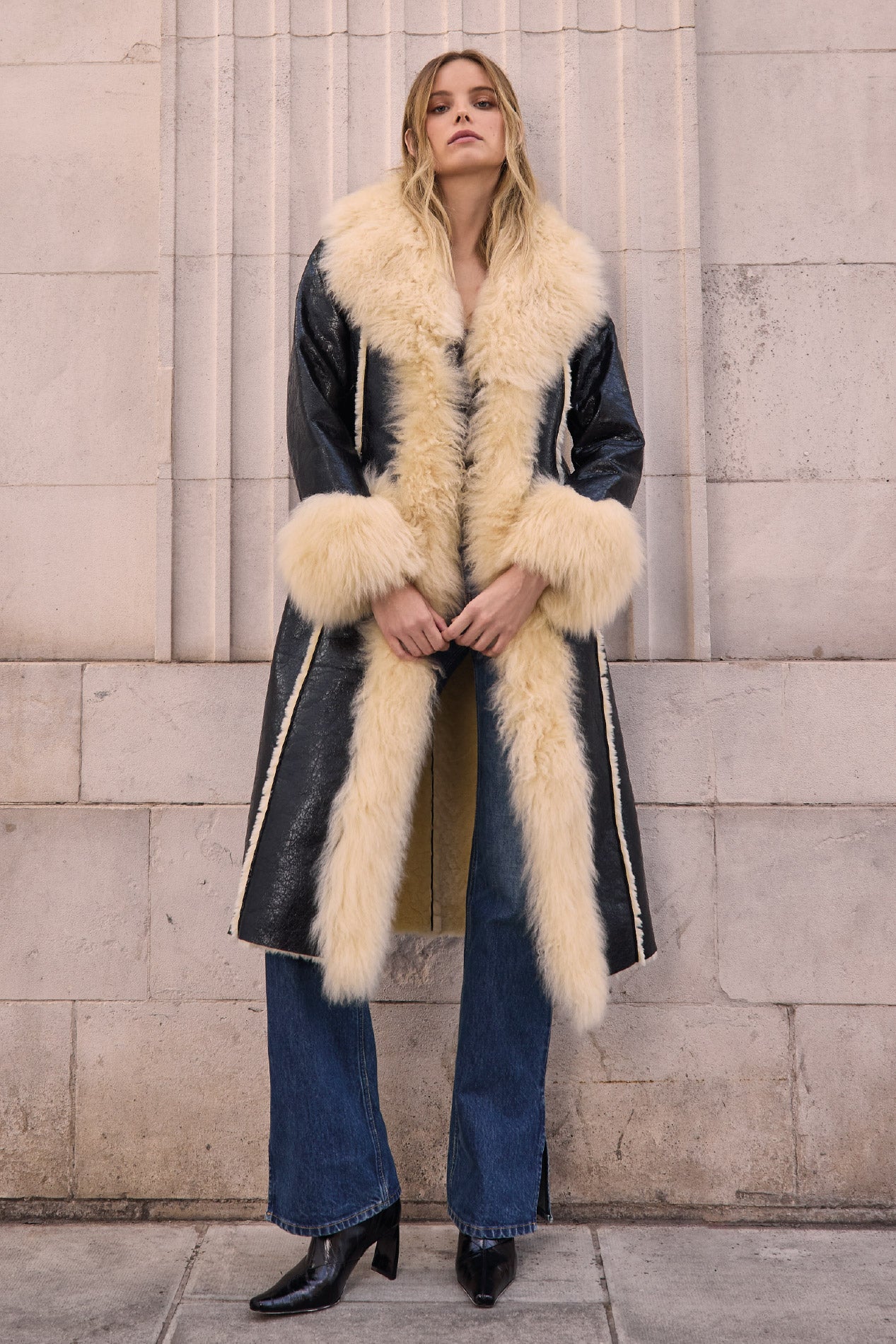 Timeless elegance with a dramatic twist - the Prince Coat features a long, sleek silhouette detailed with custard coloured trims. Crafted from distressed pleather and lined with faux fur panels, Prince pairs warmth with effortless sophistication. A true showstopper for day or night, pair with everyday basics for instant warmth and style.